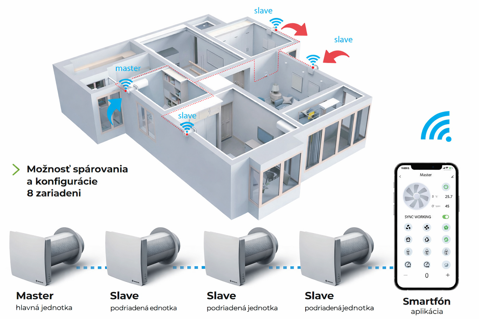 - Párovanie jednotiek - možnosť bezdrôtového párovania viacerých jednotiek pre synchronizované a efektívne vetranie.